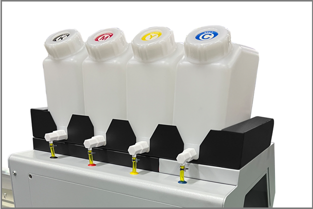 The bulk type Ink system, which is very simple and accessible, is designed for ink refilling, even during printing, to enable mass printing.